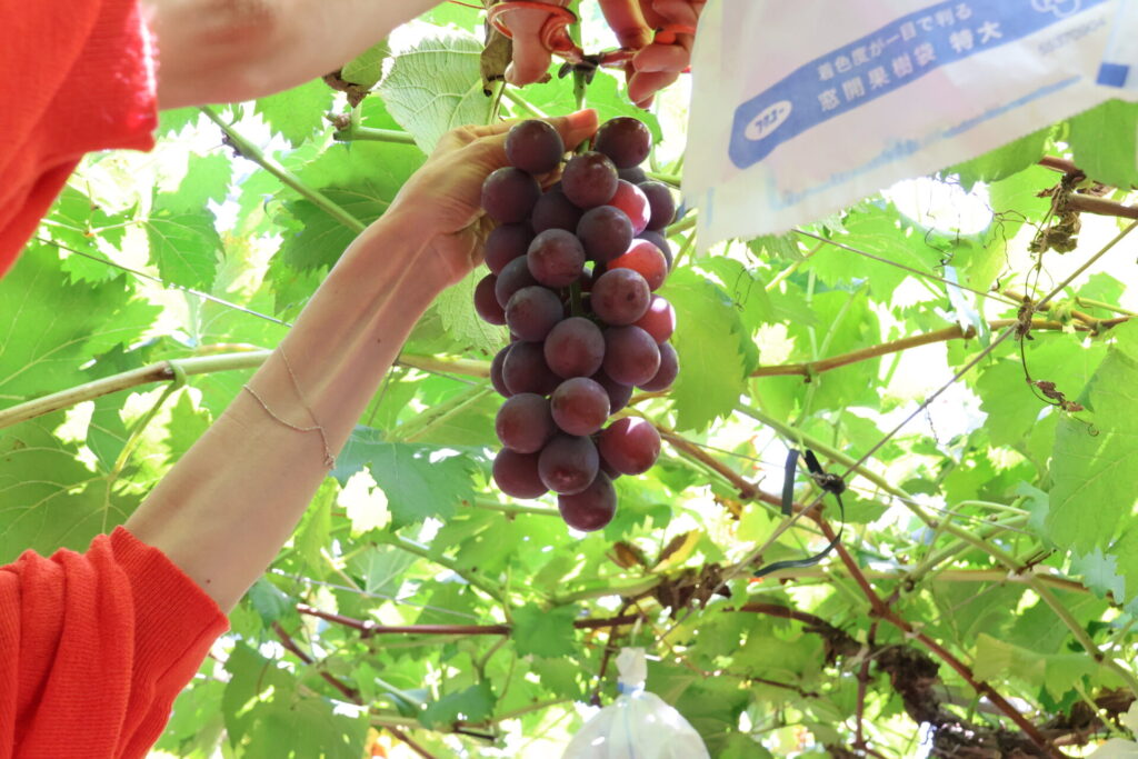 大きく実ったブドウを収穫し、すぐにいただきます。