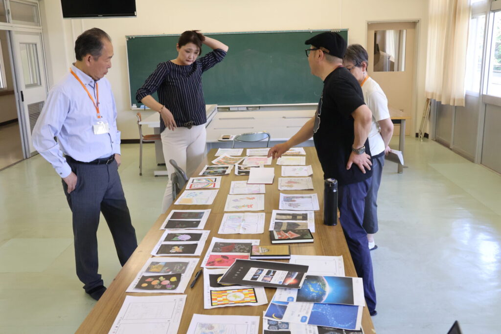 発表後は、観光協会の方々や校長先生、田中さんや講師のみなさんでどのような表紙にするか、審査会が開かれましたが、素晴らしいイラストが多く、審査は難航していたようです。